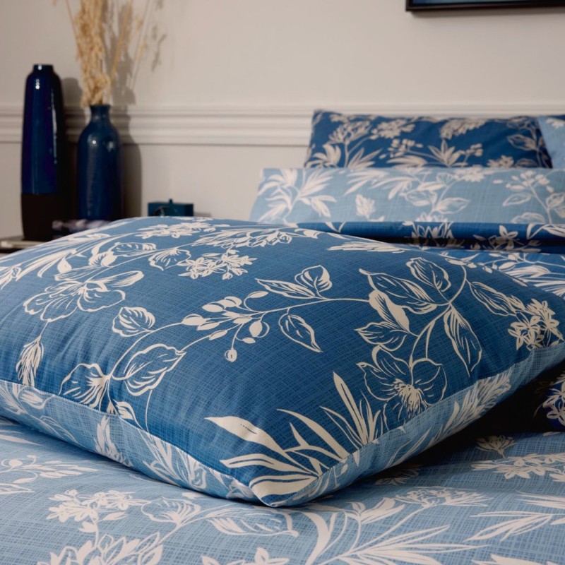 La housse de couette et les taies d’oreiller sont réversibles : elles présentent le même imprimé délicat sur les deux faces, décliné dans deux tons de bleu différents, permettant de varier subtilement l’ambiance selon vos envies. Les taies d’oreiller forme sac offrent une finition sobre et soignée. Le drap imprimé est réalisé sur le fond bleu foncé, pour une parfaite harmonie d’ensemble.