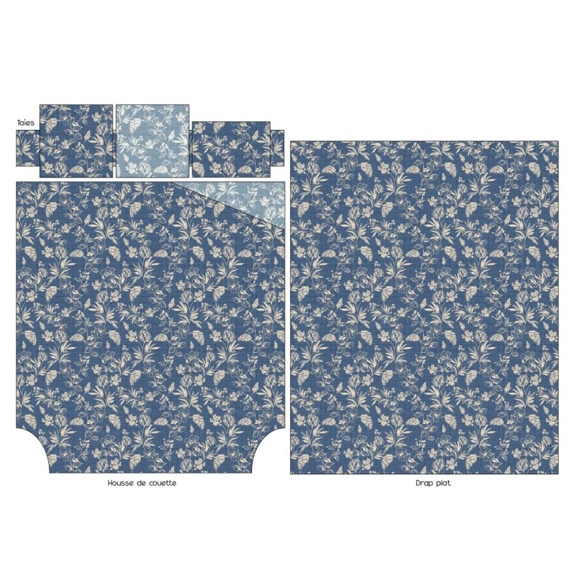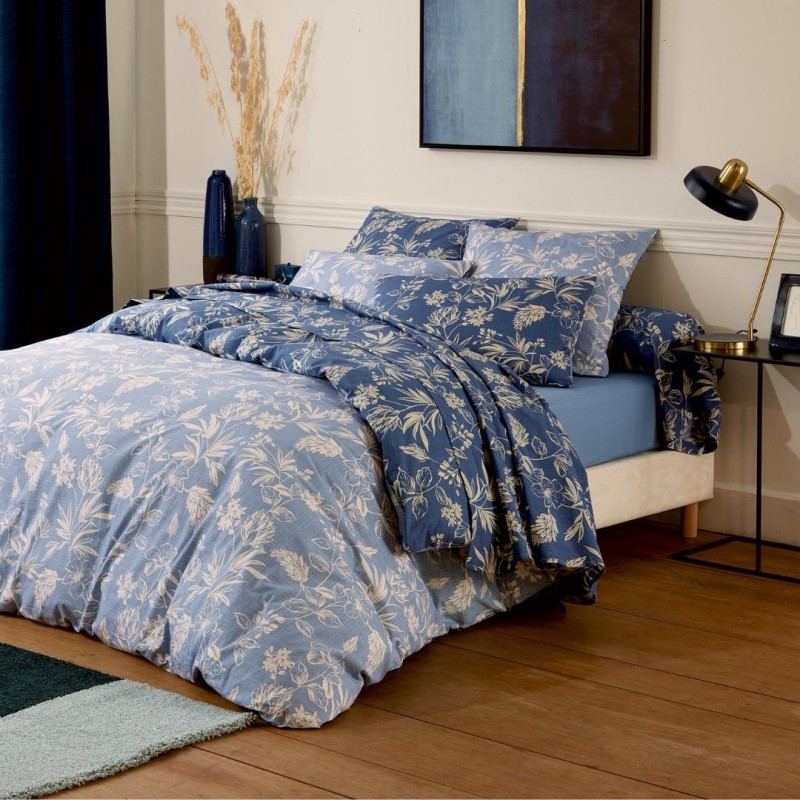 La housse de couette et les taies d’oreiller sont réversibles : elles présentent le même imprimé délicat sur les deux faces, décliné dans deux tons de bleu différents, permettant de varier subtilement l’ambiance selon vos envies. Les taies d’oreiller forme sac offrent une finition sobre et soignée. Le drap imprimé est réalisé sur le fond bleu foncé, pour une parfaite harmonie d’ensemble.